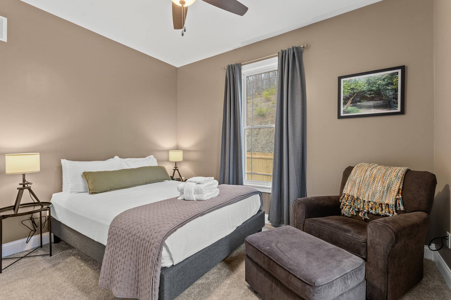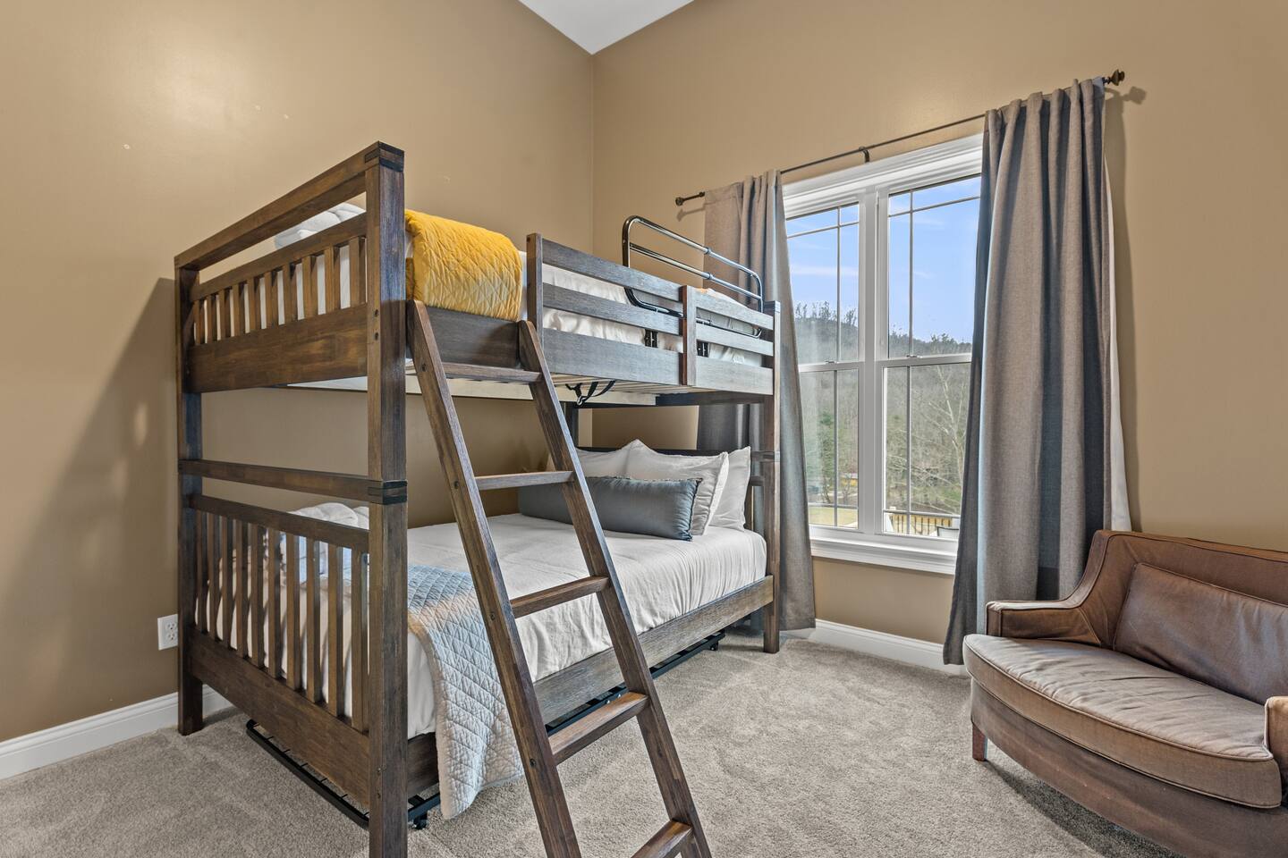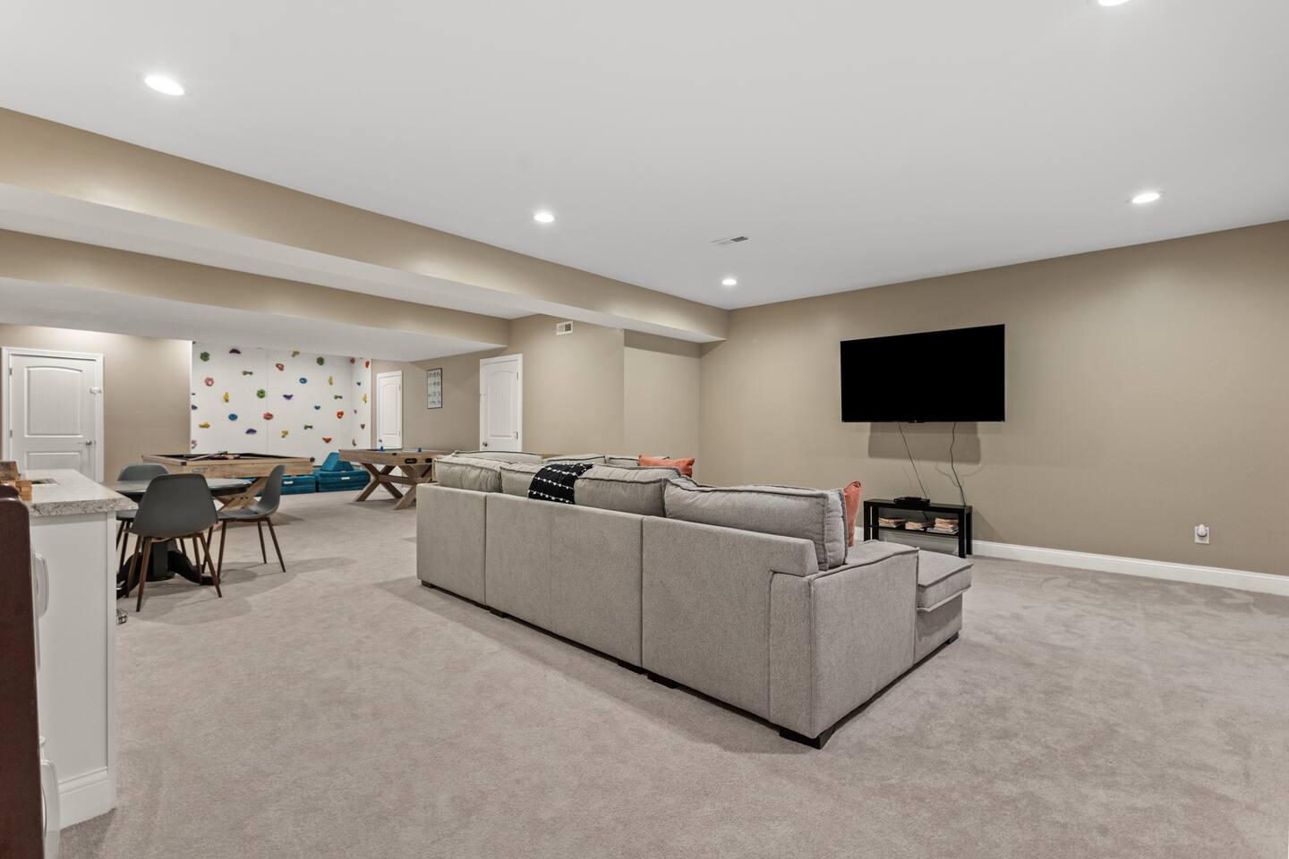 Guests will love this spacious home nestled in the heart of Red River Gorge. Designed for comfort and entertainment, the home features a chef-style kitchen, large garage, game room, theater room, and all the amenities you need for a relaxing retreat. On the main level, you'll find a luxurious primary suite with a king bed and a spacious en-suite bathroom. This floor also includes a queen bedroom and a third bedroom with a full-size bunk bed and trundle. A full bathroom is conveniently located just off the living room. The basement offers additional accommodations, including a sleeper sofa, two bedrooms each with a queen bed, and another full bathroom. Guests will enjoy a wet bar, game room, kids rock wall, and theater room. For larger parties, including events, retreats and reunions, reach out about also booking the Arch Fun Cabin as the complex share a private driveway and together can accommodate up to 26 guests (14 beds) when combined.