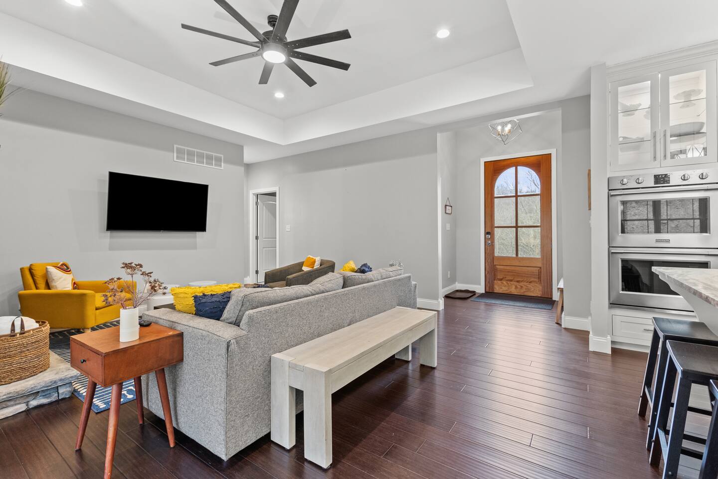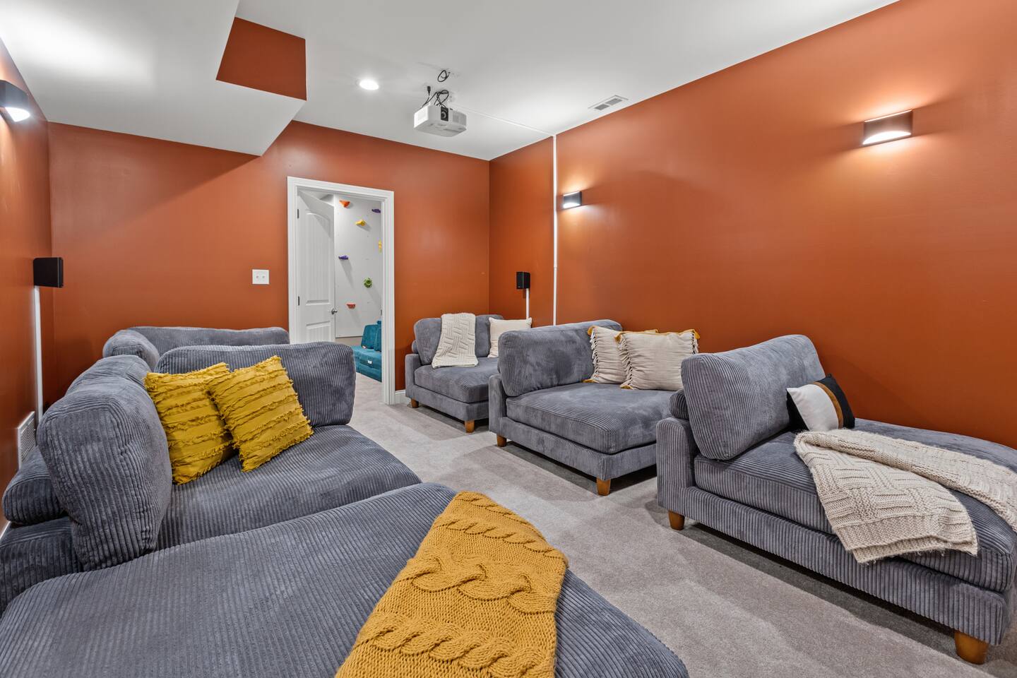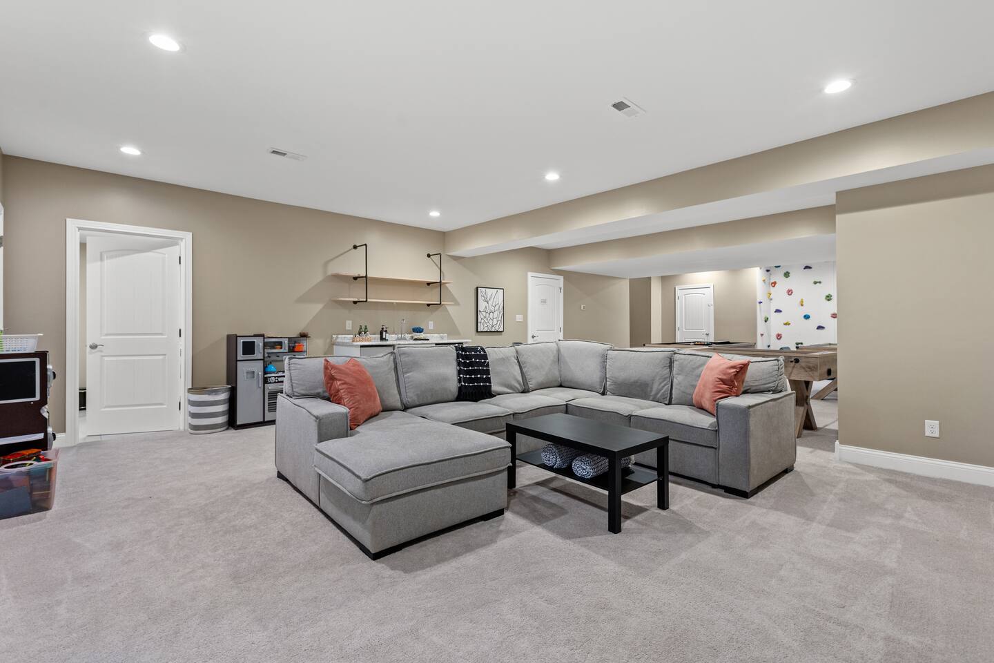 Guests will love this spacious home nestled in the heart of Red River Gorge. Designed for comfort and entertainment, the home features a chef-style kitchen, large garage, game room, theater room, and all the amenities you need for a relaxing retreat. On the main level, you'll find a luxurious primary suite with a king bed and a spacious en-suite bathroom. This floor also includes a queen bedroom and a third bedroom with a full-size bunk bed and trundle. A full bathroom is conveniently located just off the living room. The basement offers additional accommodations, including a sleeper sofa, two bedrooms each with a queen bed, and another full bathroom. Guests will enjoy a wet bar, game room, kids rock wall, and theater room. For larger parties, including events, retreats and reunions, reach out about also booking the Arch Fun Cabin as the complex share a private driveway and together can accommodate up to 26 guests (14 beds) when combined.
