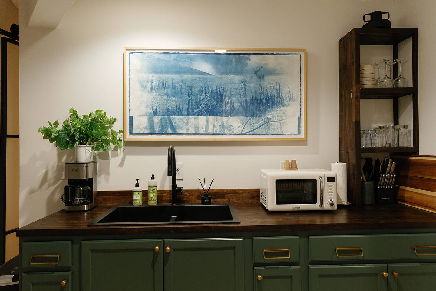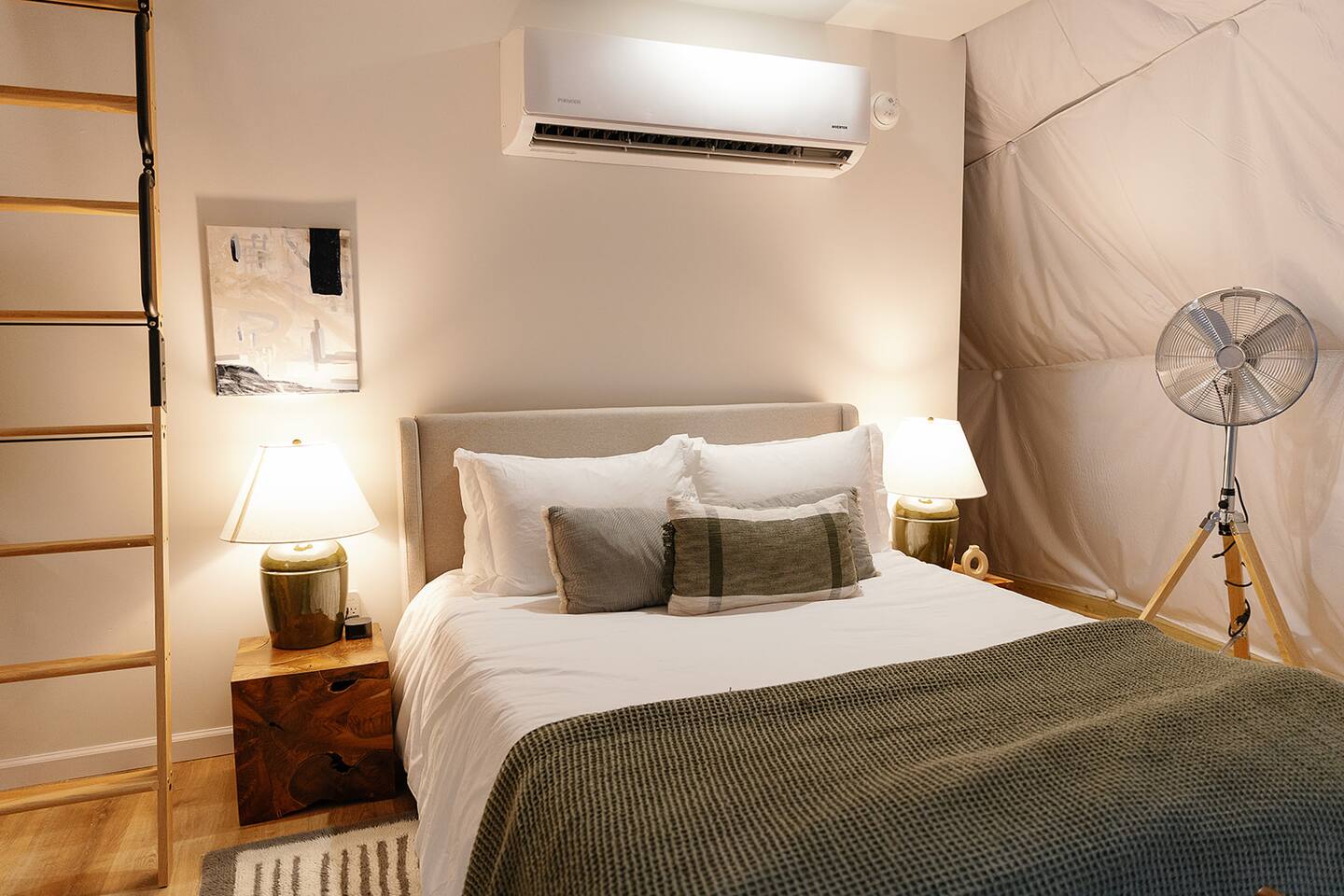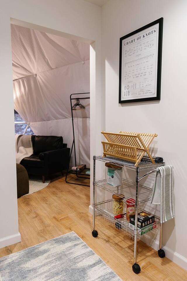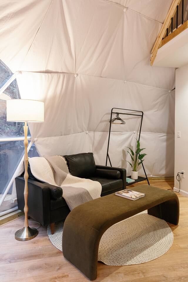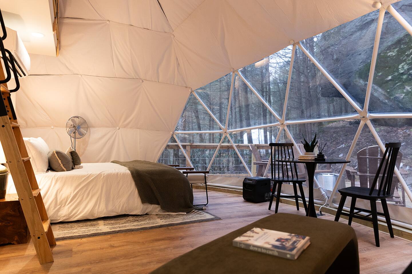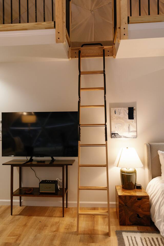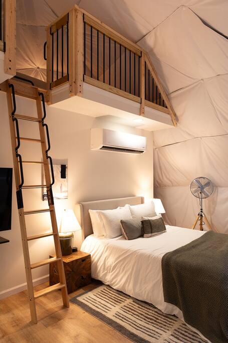 The dome provides a unique, open concept layout for your stay. There are two beds, one on the main floor and the other up above in a cozy sleeping nook accessible by ladder.