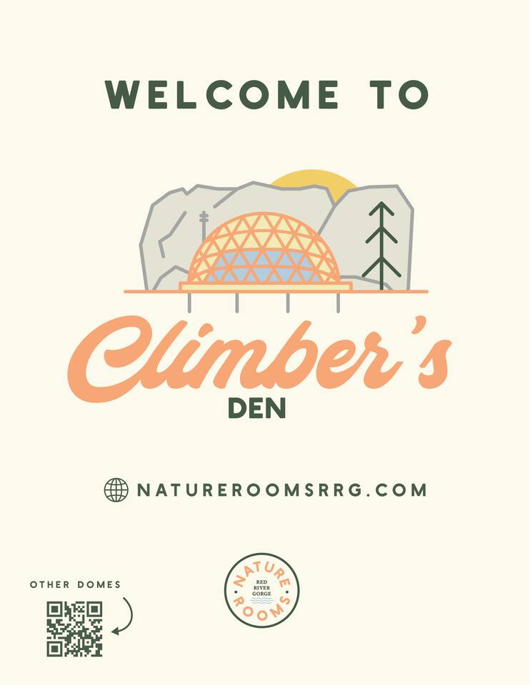 Climbers Den: rare, elevated stay in Red River Gorge, this property offers the perfect setting for an upscale glamping experience. This newly-built dome combines modern design with earthy textures- giving you a "home sweet home" type feeling. Bring your crew over the river and through the woods to our 26-acres of woodlands, with free access to Spirit Lake. Located 15 mins. from Natural Bridge State Park in Daniel Boone Nat. Forest. Come hike, climb, & explore the good ole outdoors! *4WD REQUIRED