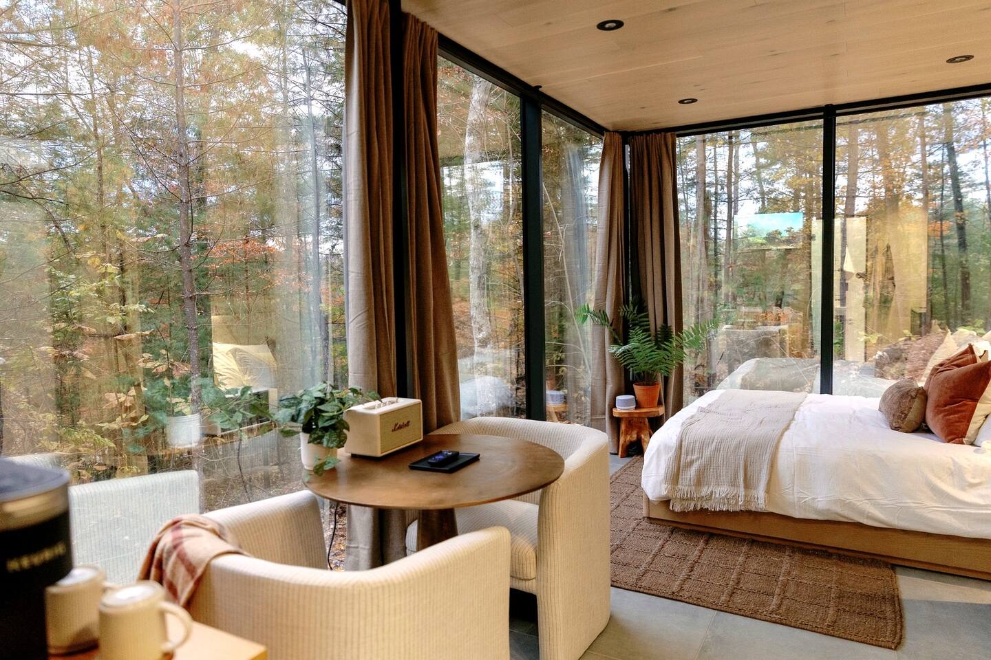 This space is really, really special. It is basically a glass hotel room in the woods. It’s a super cool experience. All of the amenities in the unit are really top notch and lux: towels, cups, sheets, the mattress. It’s like staying at a luxury hotel in the woods with some outdoor space.