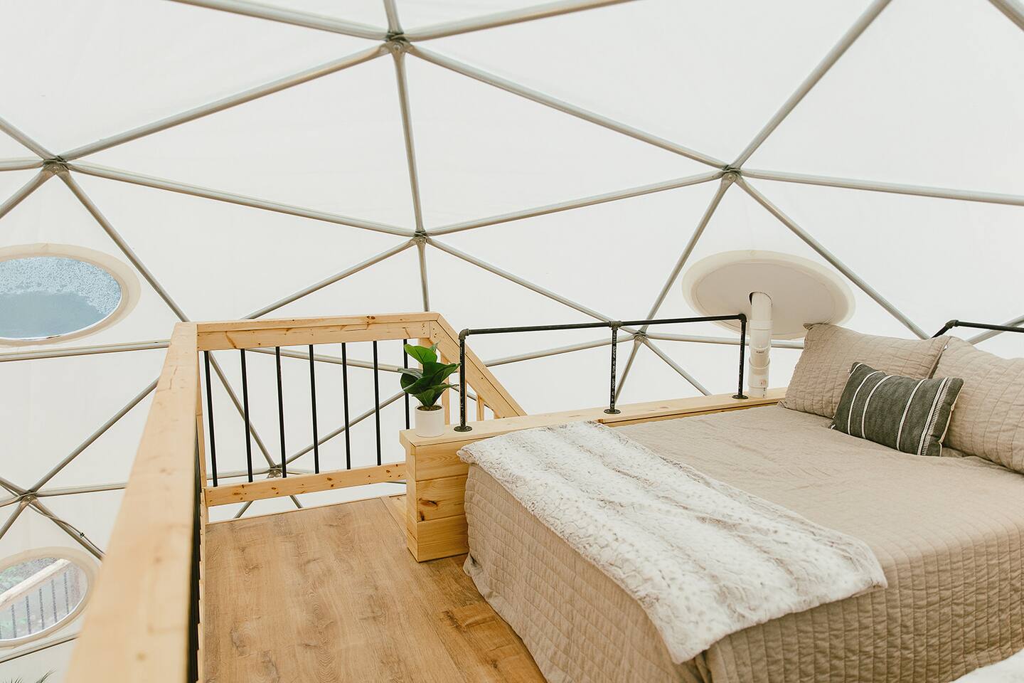Our property is located on a 40ft. wide deck structure, lofted 2 stories in the air! The structure is a geodesic dome, wrapped in heavy duty exterior vinyl, but finished on the inside with cozy cabin furnishings. The space has running water from our well, electricity, HVAC, a full-bathroom, and 3 beds that can accommodate up to 6 guests... plus a hottub :)