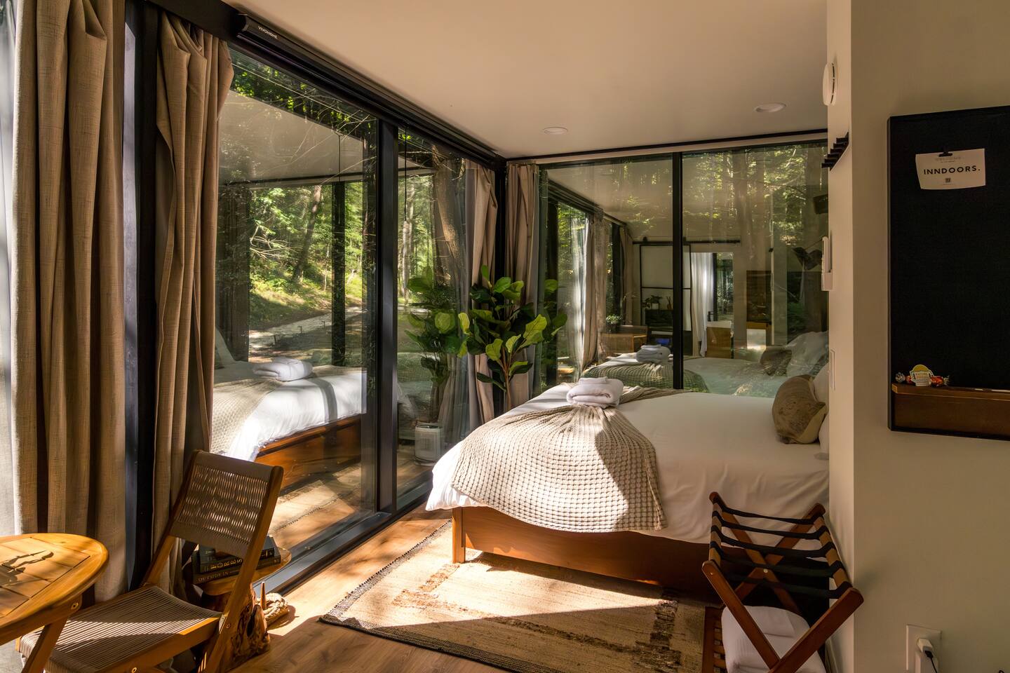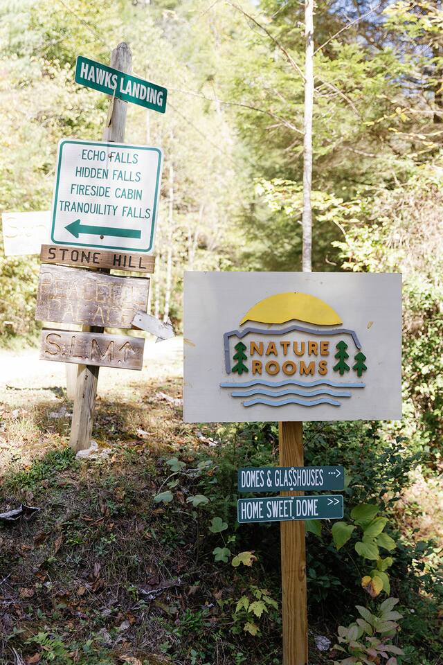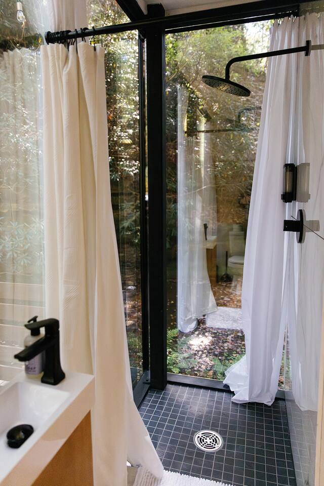 Just a little bit more information about the space! This property consists of 6 cabins, hosting multiple groups at once. We happily welcome all our guests, but kindly ask all guests to respect the privacy of others and obey all property rules. Parking is shared and located at the entrance to the Nature Rooms grounds. Your cabin is to the right of the parking area, just before the creek, and marked with a “1.” Please note, the cabin features two-way mirrored glass. During daylight, the interior is not visible from the outside, but in the evening or on overcast days, the interior can be seen. We recommend using the curtains for privacy during these times!