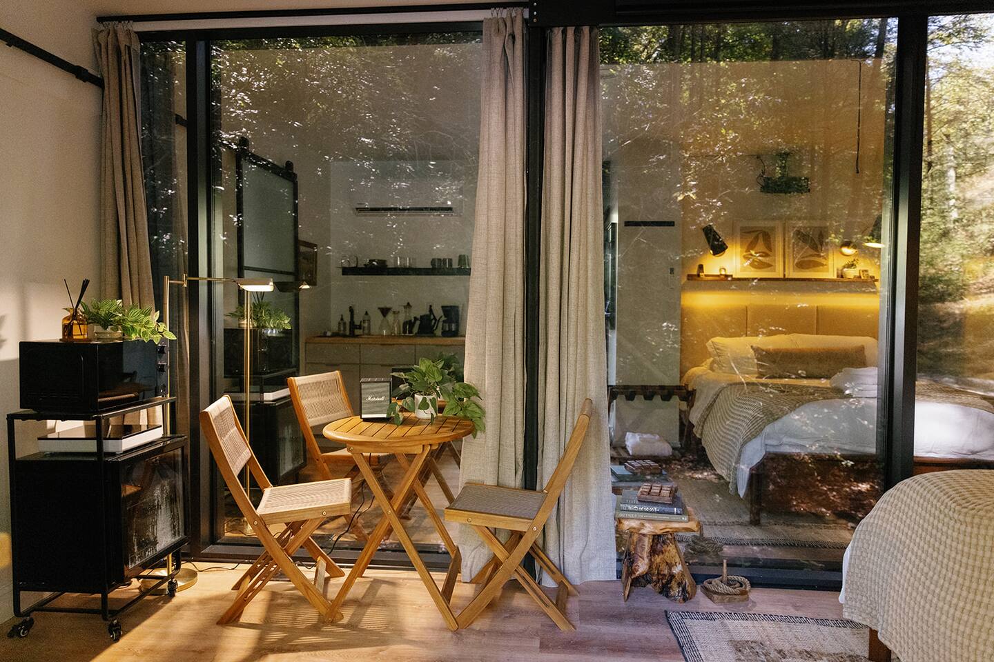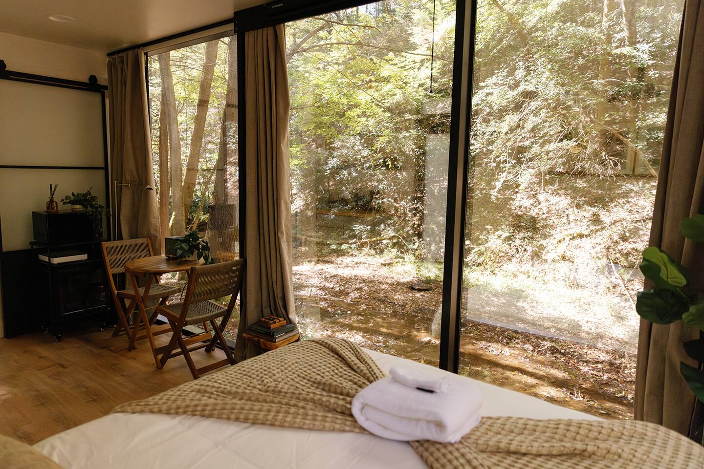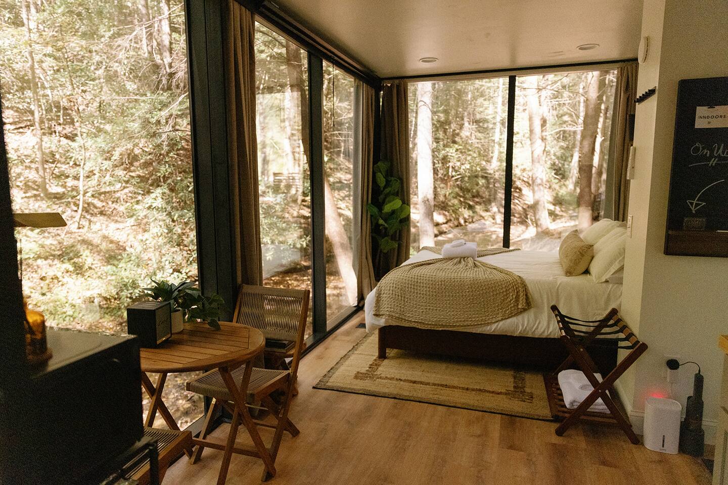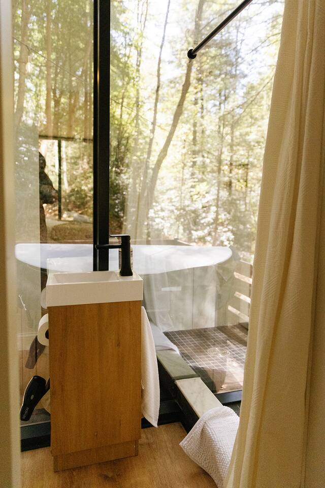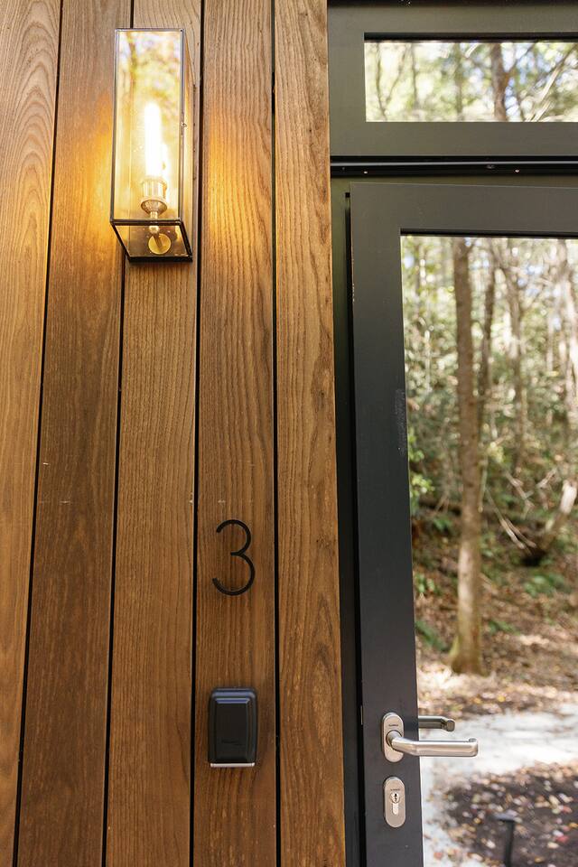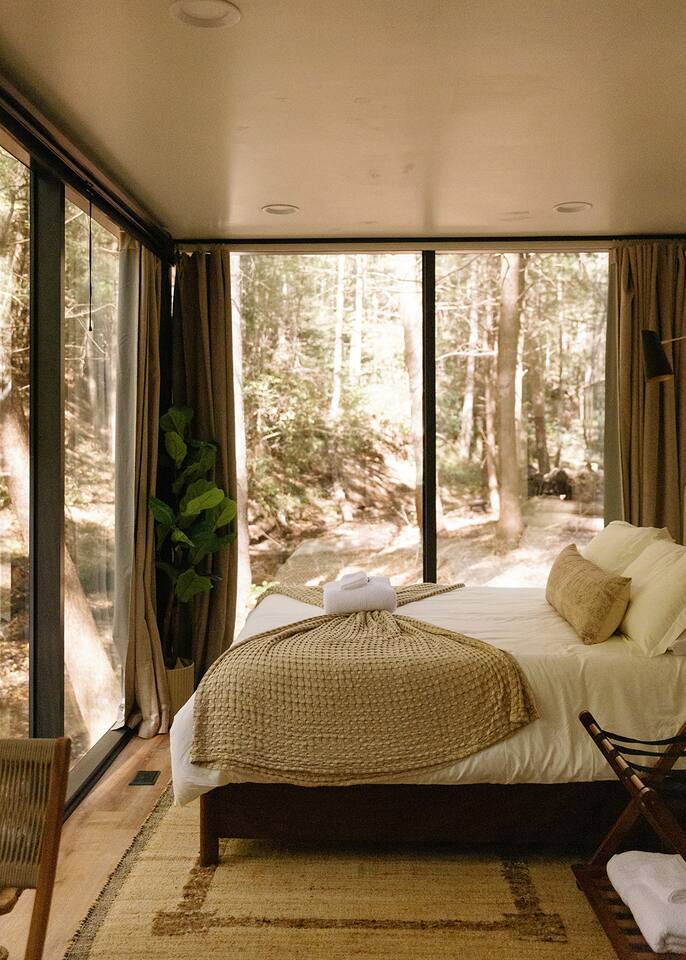 Just a little bit more information about the space! This property consists of 6 cabins, hosting multiple groups at once. We happily welcome all our guests, but kindly ask all guests to respect the privacy of others and obey all property rules. Parking is shared and located at the entrance to the Nature Rooms grounds. Your cabin is to the right of the parking area, after crossing the concrete bridge over the creek, its the farthest glass house and marked with a “3.” Please note, the cabin features two-way mirrored glass. During daylight, the interior is not visible from the outside, but in the evening or on overcast days, the interior can be seen. We recommend using the curtains for privacy during these times!