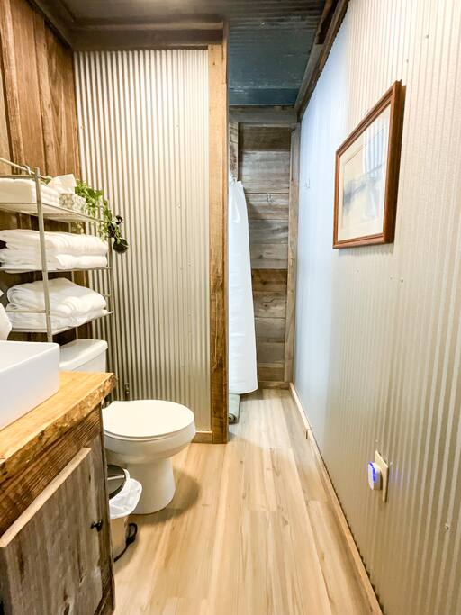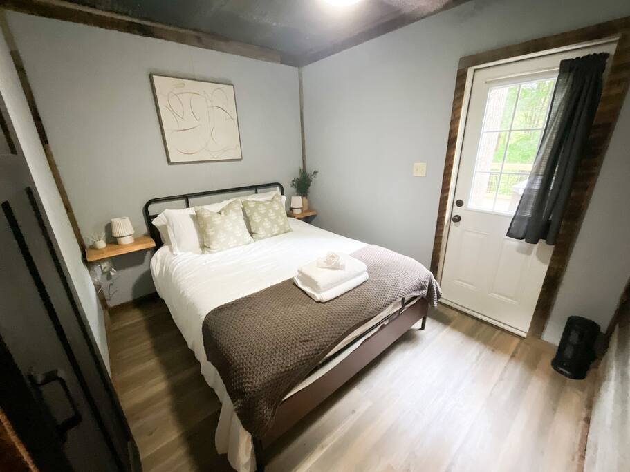 The first bedroom is located in the main entry room of the cabin. There are also a couple of lounge chairs and bar seating for up to 4 guests! Then the second bedroom is located down the back hallway of the cabin. Both bedrooms have an exterior access door for easy entry in and out :) The property also has a full-bathroom and a fully stocked kitchen with a coffee area, microwave, glass top stove, and all the vessels you would ever need for your stay. The back deck is partially covered, and also has a hot-tub!